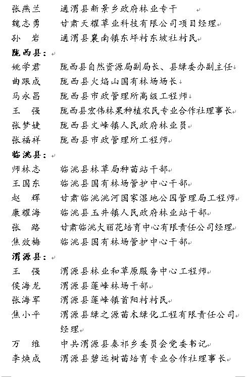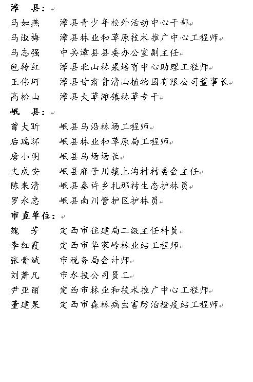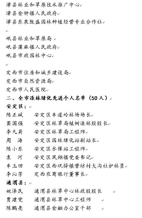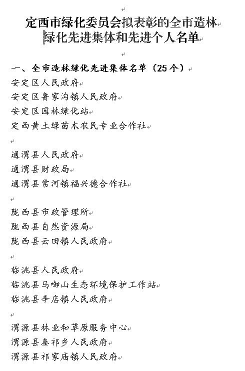 为了认真贯彻落实习近平总书记“绿水青山就是金山银山”等生态文明建设思想,激励全市广大干部群众以饱满的热情,积极投身于全市造林绿化事业,全面推进生态文明建设,定西市绿化委员会拟在即将召开的“绿满陇中暨全市城乡林业生态建设动员会”上表彰一批造林绿化先进集体和先进个人。按照《定西市林业和草原局关于推荐拟以市绿化委员会名义表彰的全市造林绿化先进集体和先进个人的通知》(定林办发〔2021〕29号)精神,经全市林草系统逐级推荐,市绿化委员会决定,现对拟表彰的安定区人民政府等25个先进集体和陈正斌等50名先进个人予以公示。公示期为2021年3月17日至3月23日,公示期间,任何单位或者个人如对公示对象有不同意见,请以电话、传真等向市绿化委员会办公室反映情况。反映情况须客观真实,以便于核实查证,以单位名义反映情况的材料需加盖单位公章,以个人名义反映情况的材料签署真实姓名并提供有效的联系方式。超出期限的异议不予受理。